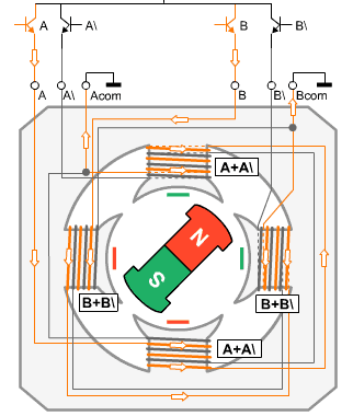 You can see in the example, when coil "A" is energized, A north-south polarity is generated at "A+A\" as shown in the figure above and magnetic shaft automatically align itself according to the poles generated. When the next coil is energized the shaft again align itself and take a step. Hence the working principle.